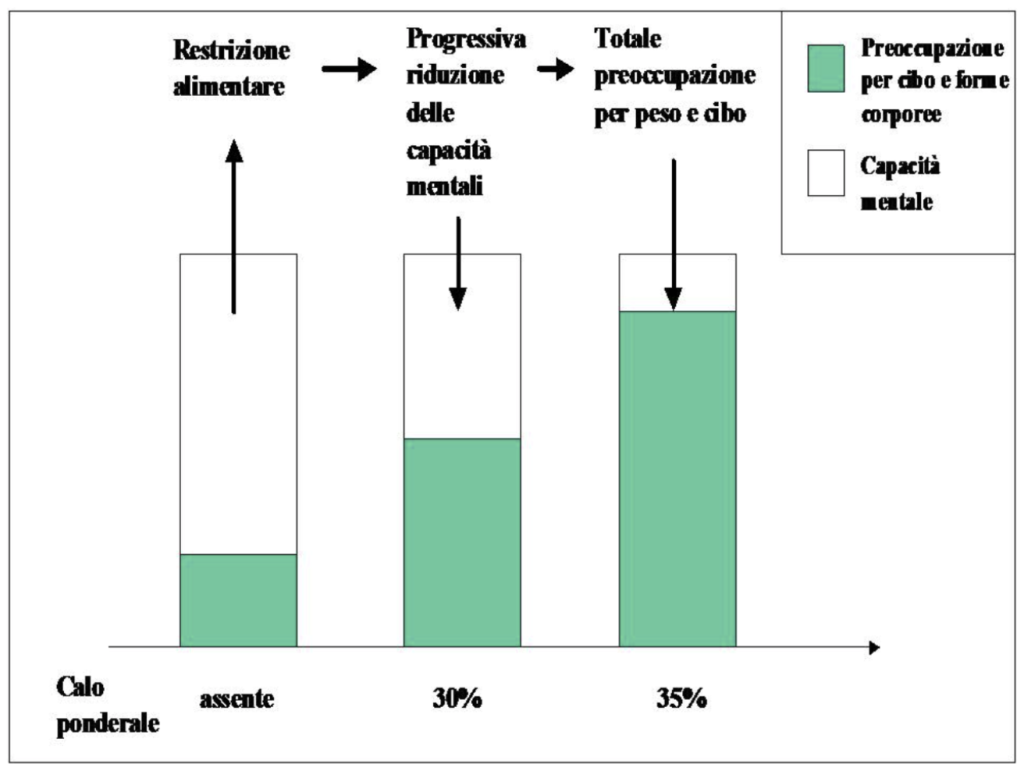 Un elemento cruciale nello sviluppo dell’anoressia nervosa è rappresentato dalla comparsa dei sintomi da digiuno (vedi tabella n.1), ossia di conseguenze sul piano psicologico e fisico della restrizione alimentare. Le conoscenze a questo proposito derivano da un filone di studi che data ormai quarant’anni, iniziato presso l’Università del Minnesota. Le persone che si sottopongono ad una alimentazione ridotta, dopo una prima fase caratterizzata da euforia ed iperattività, sviluppano una complessa sintomatologia che coinvolge aspetti organici e psichici. Sul piano psicologico si riscontra un’attenzione polarizzata sul cibo, che porta il soggetto a imperniare tutta la sua quotidianità sull’alimentazione, talvolta con comportamenti bizzarri. Si assiste a modificazioni importanti sul piano emotivo con l’emergere di stati depressivi, ansiosi e di irritabilità; talvolta si possono riscontrare manifestazioni psichiatriche anche di maggiore gravità.