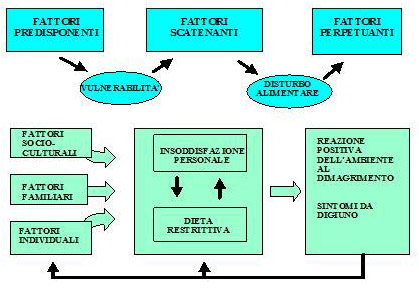 Per avere un’idea corretta della dinamica dei disturbi del comportamento alimentare bisogna tenere presente una serie di eventi alcuni dei quali giocano un ruolo nella creazione di una vulnerabilità al disturbo, altri nel passaggio dalla vulnerabilità al disturbo vero e proprio e infine nella costruzione di un circolo vizioso che mantiene la malattia.